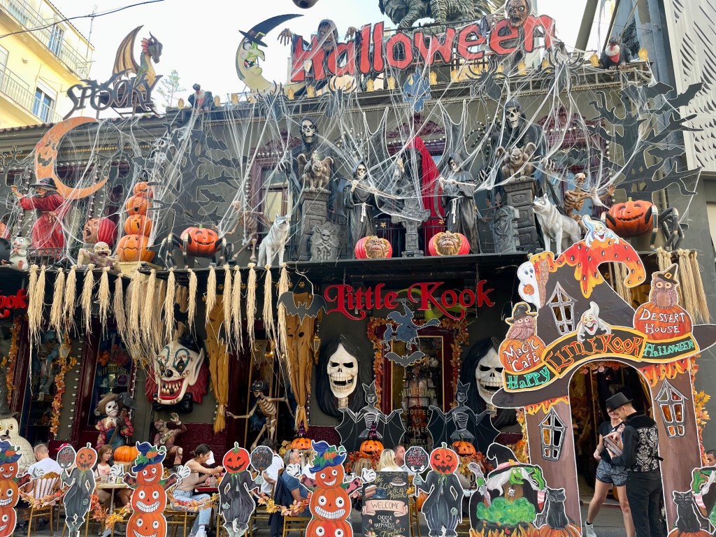 Described by visitors as quirky, fun, and whimsical, this little gem of a café was one of the highlights of my own trip to Greece in 2023. I had learned about it from a Greece travel Facebook group, and could tell from people’s photos that I absolutely needed to visit. However, since there was no schedule posted online we did not know what theme would be up during the timeframe we would be in Athens. To my immense delight, it was decorated for Halloween, and not only was the café itself decorated, but the entire alleyway leading up to it as well!